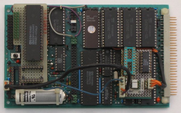 This card contains a Z80 cpu, Z80 DART, Z80 CTC, RTC (OKI 6242), 8 kByte ROM, 96 kByte RAM and a 8255 for the bus. Modifications are a custom RS-232 level converter, bypassing the 1488/1489 sockets, and battery backup for the RAM. The current firmware has a console on channel A of the DART. (9600Bd, 8 bits, no parity, 1 stopbit). More info with the custom card for the project. |