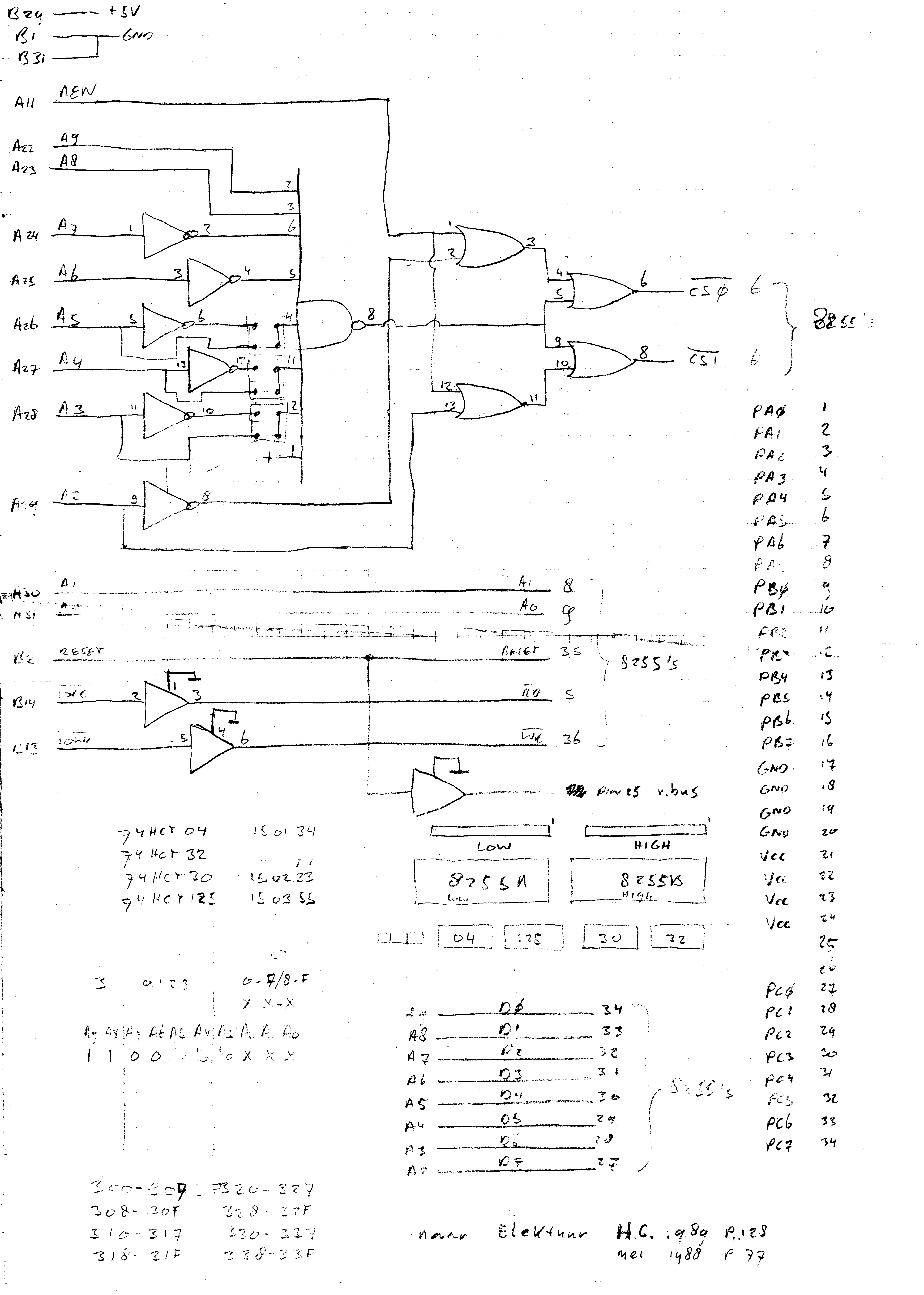 At the left a ISA-bus board containing two 8255 PPI chips and decoding logic. Jumpers allow it to be placed in the 0x300 address area, reserved for experimental boards. The idea came from an old Elektor and I just implemented two 8255s instead of just one.