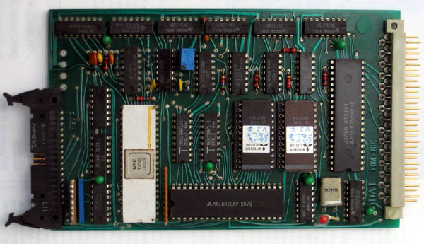 The floppy disk controller is based on the NEC D372D. The card contains an CPU complete with RAM and ROM to handle the data. This simplifies the main processor load.