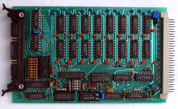 Contains 32 kByte. Two banks of 4116 dynamic RAM. The rack connector at the right is the DCE bus, so the processor was directly connected through the flatcable connector at the left side.