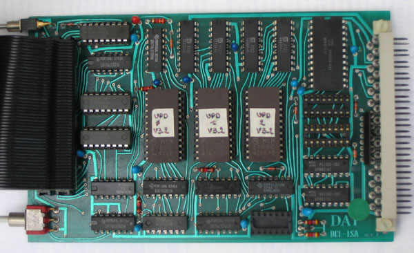 DAI  card This board allows experimenting with the DCE bus. Drivers and LEDs for outputs, pullup resistors and dipswitches for inputs. A power connector (-5,+12,GND,+5V) and some reset and interrupt controls at the top. The sockets at the bottom are test points for each line. At the left the connector to the DCE-1. The Connector layout.