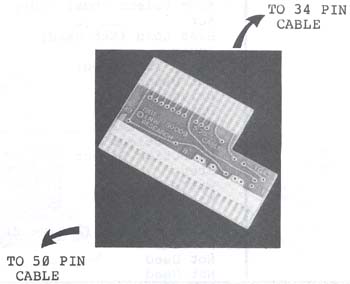 Connecting an 8" Disk Drive Eight-inch drives require 50 - wire ribbon cables for operation, You will notice that the disk interface on the computer is made for a 34-wire cable (17 connections on each side). A 50-to-34 adapter board is available from LNW (stock# 1096) to connect the 8" drive to the 34-wire cable. One end of this board plugs into the 8" drive cable-connector (50-pin), the other into the 5-1/4" drive cable-connector (34-pin) as shown in Figure 5.1. If the connector on the 34-pin cable has pins pulled, you may only connect one 8" drive per adapter. Otherwise, the drive select process will not be able to "see" any 8" drive after the first one it encounters. If the cable is not of the pulled pin type, then you may connect a few 8" drives to the 34-pin cable using just one adapter. Figures 5.2 and 5.3 outline the rights and wrongs of the matter. Figure 5.1 - 34 to 50 Pin Adapter