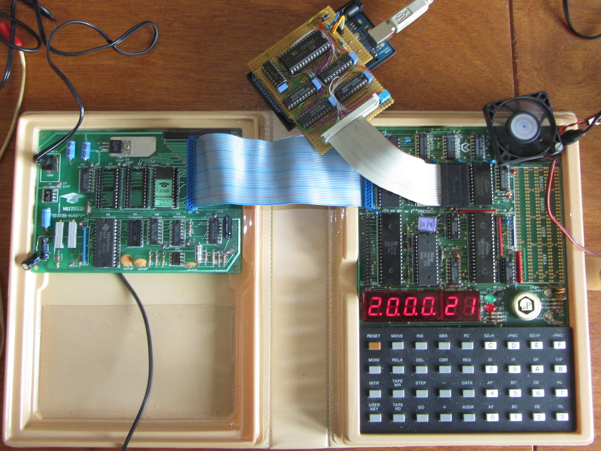 The MPF-1 with SSB-MPF and prototype ROM-amulator installed.