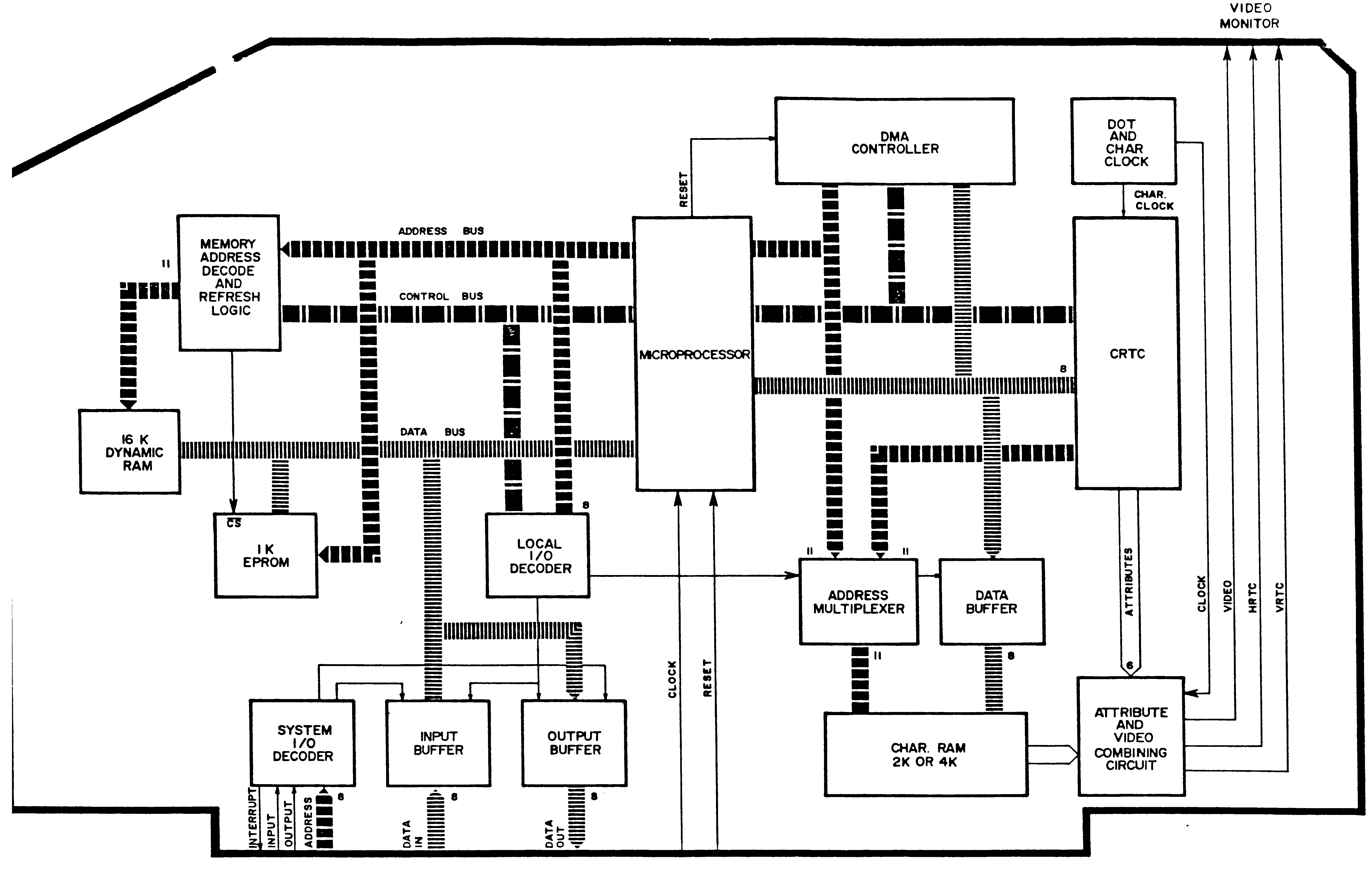 Z80 CPU, EPROM (1 kByte), Intel P8275 CRT Controller, Intel P8257 DMA Controller, 16 kByte dynamic RAM. I/O ports used: VDB80 handshake/status 13h VDB80 data read 14h VDB80 data write 15h |