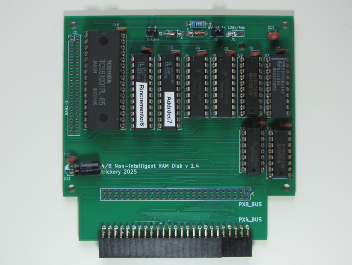 It is notable all Epson made RAM Disks use dynamic RAM, probablty the most economic option in the 1980s. It is nice that there are better options now. The board has a simple provision to attach a 3V battery, making the RAM contents persistant. A more reliable solution is replacing the SRAM with a DS1245Y persistent RAM device or an STK14CA8C based module.
