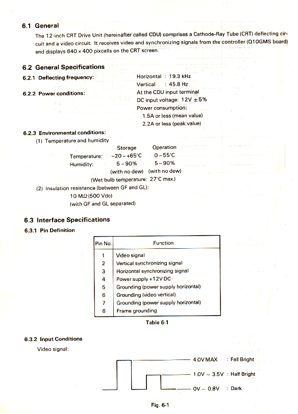7-pin 8-pin monitor QX-10 function wire color (original) ------- ----- -------- ---------- 1 ------- 8 video shielded wire 2 ------- 5 v. sync grey 3 ------- 4 h. sync red 4 ------- 1 +12 V brown 5 ------- 2 sync gnd green 6 ------- 7 video gnd shield 7 none 3 none 6 none