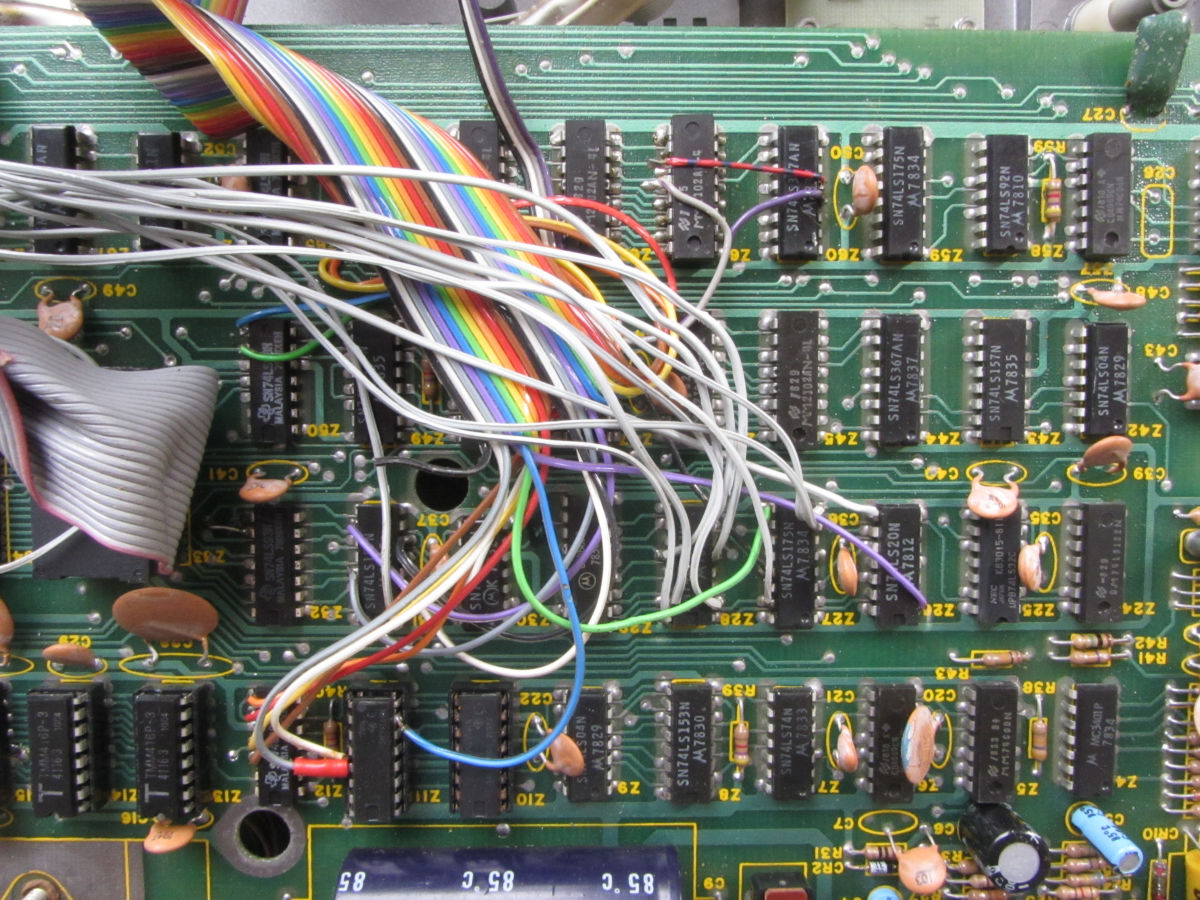The HRG1 is connected to the TRS-80 with two flatcables: a 16 wire and a 24 wire cable. The HRG1 output is OR-ed with the original video signal. In this instance there is also an extra board connected with eight wires to the HRG.