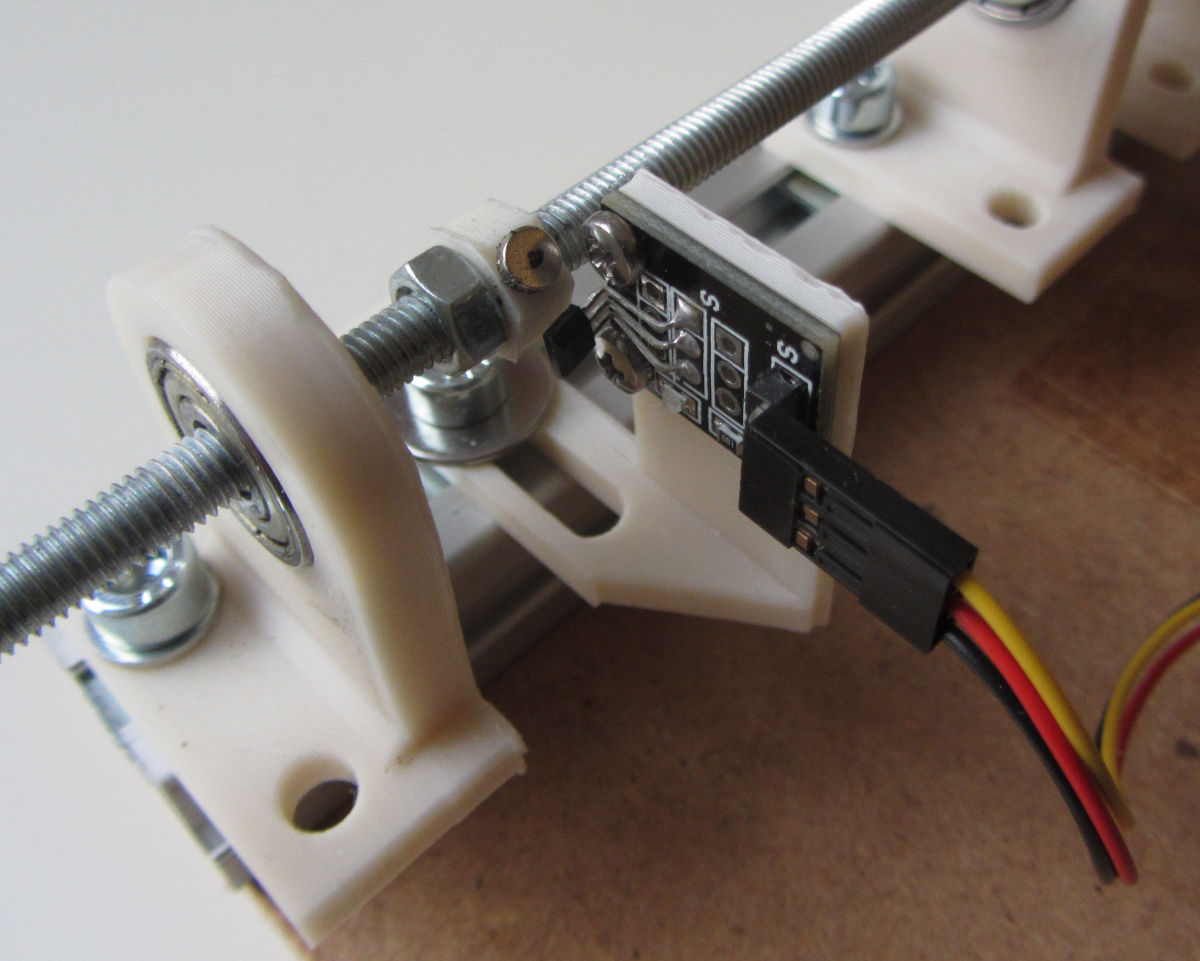 The sensor is the standard KY-003 breakout board. It has a nice LED indicator to help tuning the sensor-magnet distance. The magnet is a 6x2 mm neodymium magnet glued to a 3D-printed nut. Mark the proper magnetic polarity before applying the glue. The sensor board mount has an option for adustments. |