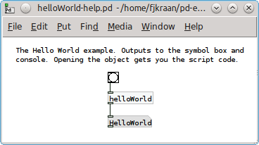 The ubiquious Hello World! variant in TclPd. It prints its text in a symbol box and the Pd console. |