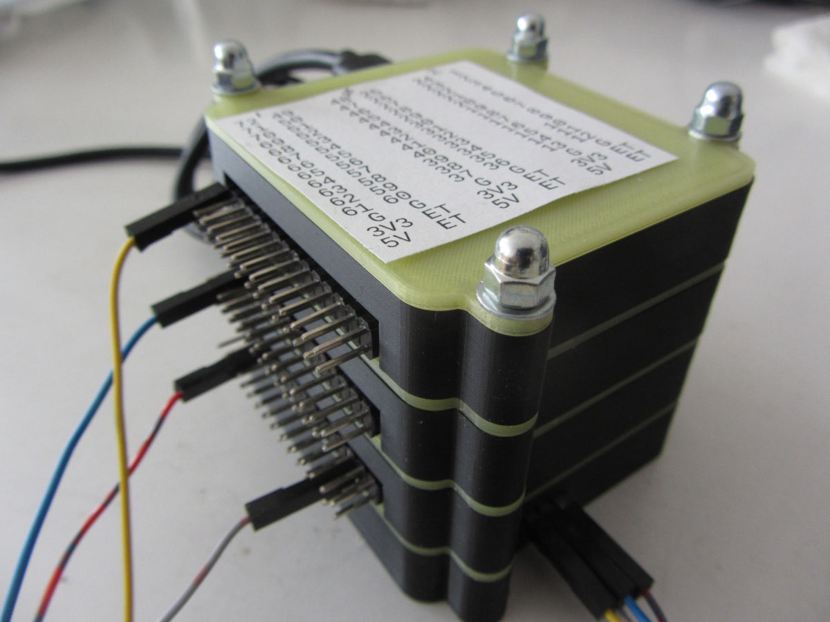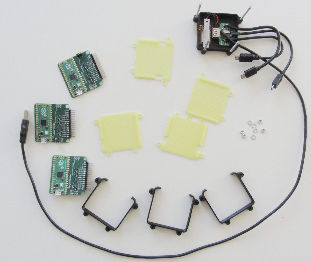 Above is a three board device, the lower case contains an USB hub to simplify cabling. There is also an optional oscillator in this case to help test the boards.