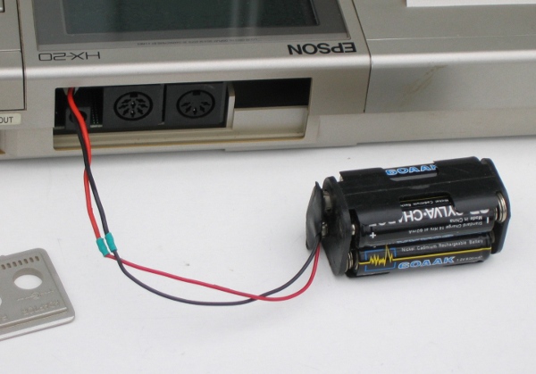 Nowadays not much of the original battery packs for the HX-20 will be in good working order. With some trouble and quite a sum of money, you can still buy replacements or make one yourself from NiCD C-cells. For operating the HX-20 only once in a while, this is not very cost effective. Replacing the internal pack with an external set of modern penlight (AA) NiHM cells works just as good, but has its price; making an extra hole or leaving out the connector pane. The battery is an essential part of the power supply; charging keeps the adapter voltage in check. Without it, the voltage on the circuit board becomes much too high and using power hungry peripherials lead to the 'CHARGE BATTERY!' message. |