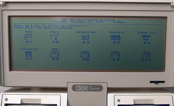The Convertible was also IBM's only PC (XT) with standard a battery back-upped clock. Shown here is the Convertible with a typical application, the Application Selector, which runs only on a Convertible. It can still be downloaded from the IBM site. Battery data: 9.6v/2400mAh (NiCd). The power supply is 15 VDC, 2.7A and the pin is plus (barrel minus). |