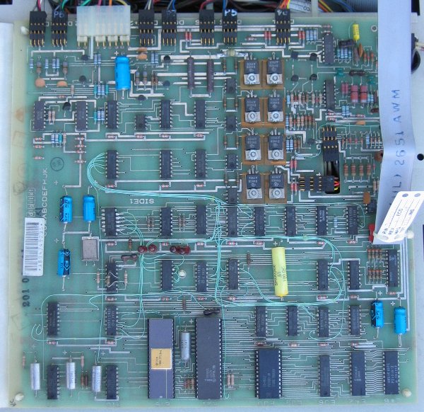 The RAM chip type is Fujitsu MB8116 (16k x 1), So total RAM is 64 kByte, or more likely 32 kWord. The flatcables at the lower left lead to the serial port boards. The UARTS are Signetics 2651. The LEDs (top left) are the front panel indicators. |