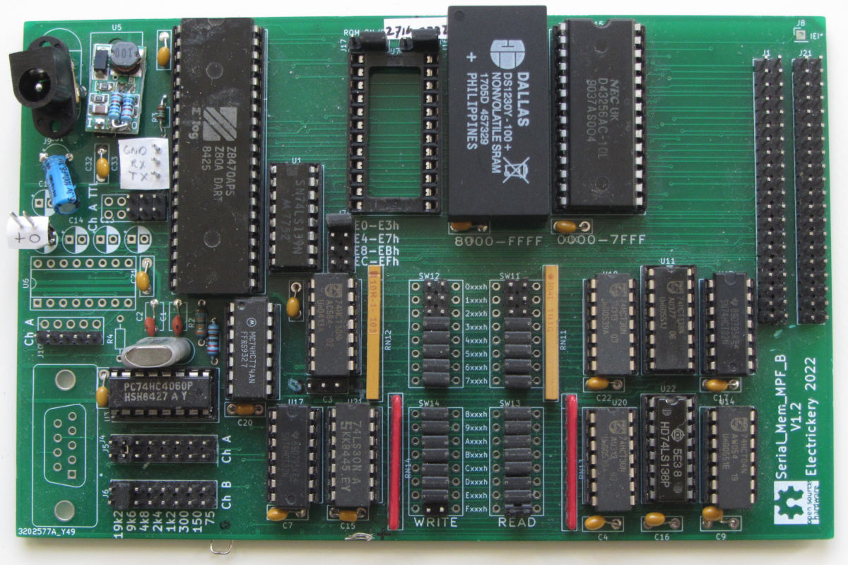 The Serial & Memory Card is part of an effort to make a Z80 system, in this case the MPF-IB, as easy to program as an Arduino. It contains a serial port, with a monitor in ROM and a configurable amount of memory.