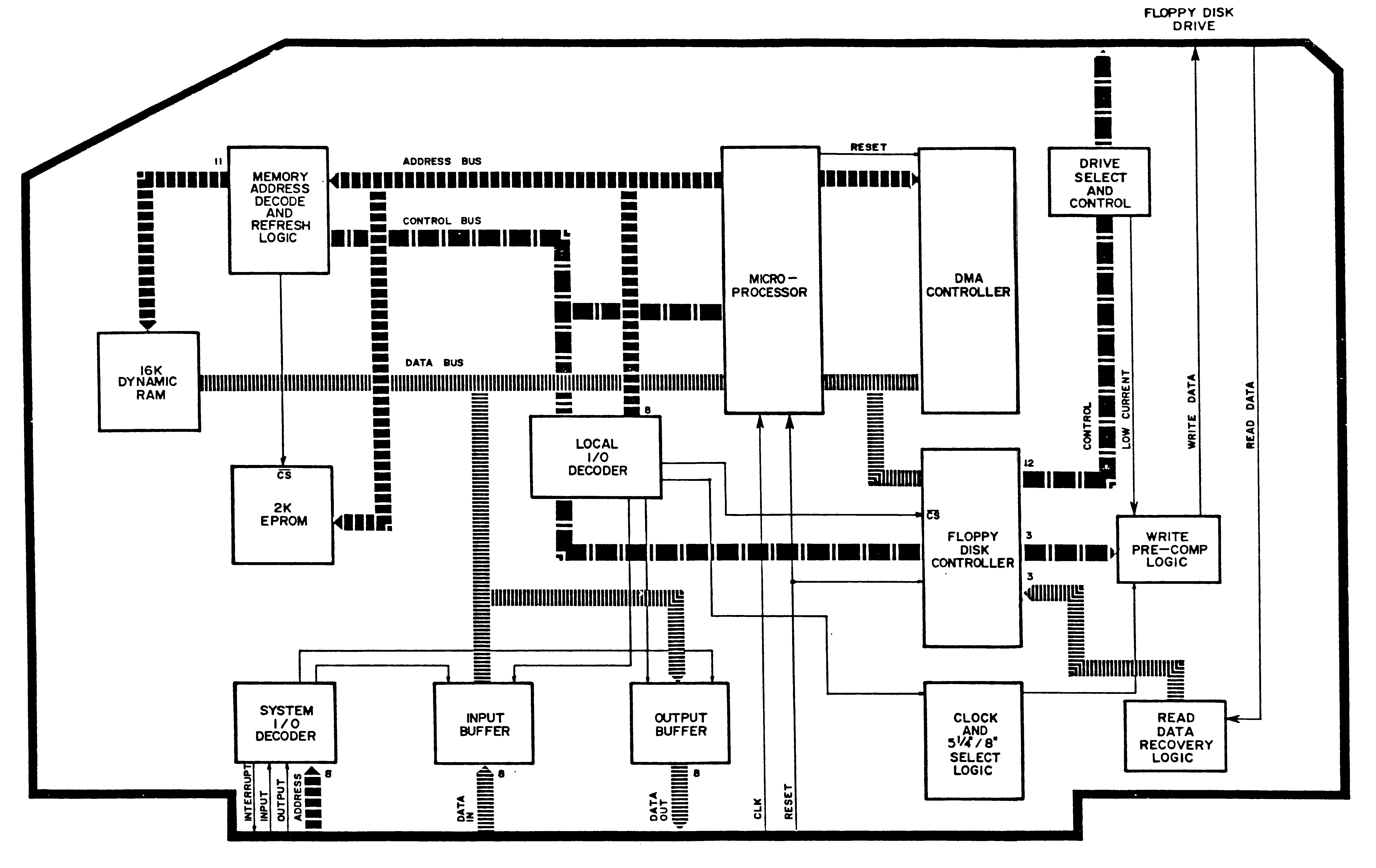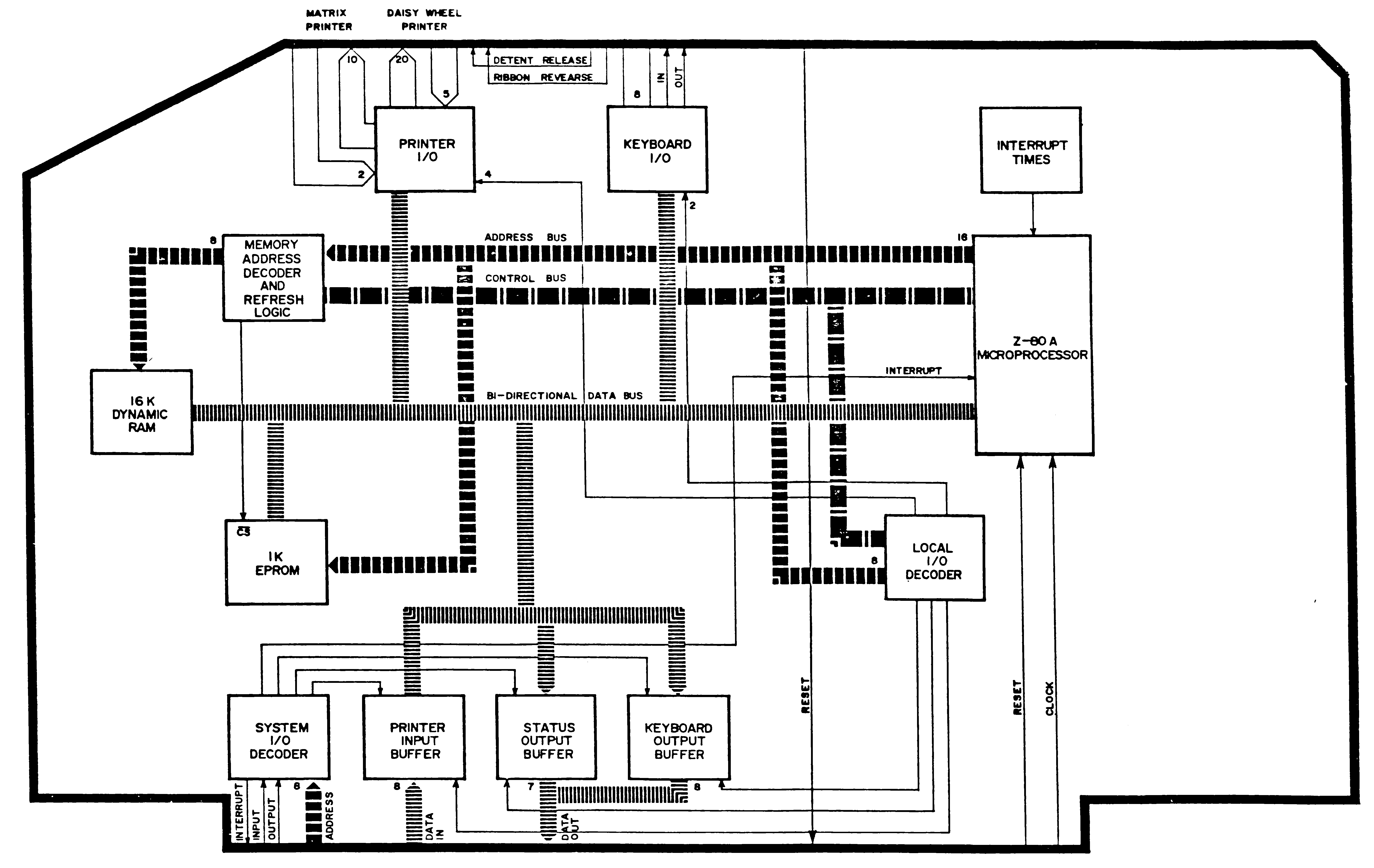 Z80 CPU, EPROM (1 kByte), parallel ports for keyboard and daisy wheel printer and 16 kByte dynamic RAM.