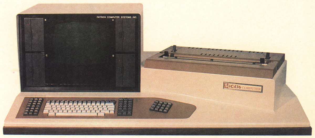 The generic internet has next to nothing on Patrick Computer systems, but delving into archive.org does result in advertisements between 1979 and 1982. They had subsidiaries like KIT-80 INC. which sold an 'E-Z-80 ENTRY KIT' (an single board computer) or TRS-80 memory upgrades. In these ads the proudly mentioned PCS is the manufacturer of the "IC436 integrated business computer". In the November, 1982 Electronics Today International magazine had a advertisement with bargain boards taken from the iC 436 computer. |