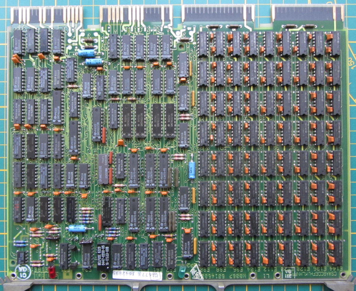 This dynamic RAM board has 9 * 8 NEC4164: 256 kWord with parity. This is more than enough for running (small) programs. Once the Boot/Diagnostics ROMs started working, it reported RAM errors: ERR 3 MEMORY FAULT ADDRESS EXPECTED ACTUAL 00400000 177400 177600 FF00 FF80 > D7 bit stuck on 00400000 052525 052725 5555 55D5 > D7 bit stuck on 00420000 177400 177600 00420000 052525 052725 ....With the User Guide available, this appeared to be bit 7 of row 1, IC 135. Replaced this with a NEC D4164-3 (150 ns), and the errors were gone.