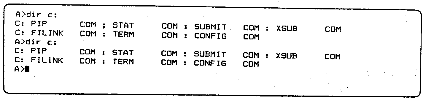 If the sequence of clearing the screen and printing two directories of the C: drive is performed with screen 1 turned on (it can be chosen by using the CON-FIG program described in Chapter 3), then the screen will show the following output.
