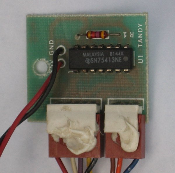 The board has two functions: create a Drive Select indicator and add a Write Protect feature to a hard disk. As the indicator is an incandescent lamp a driver is needed to interface the TTL logic levels. The Write Protect feature is a Tandy addition to the standard hard disk interface. The signals are connected to some test points on the diskdrive board. |