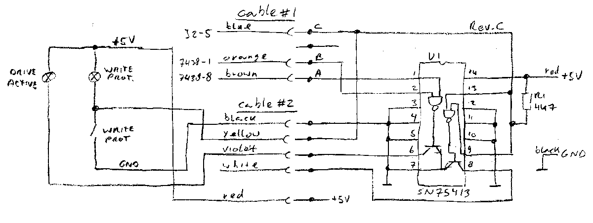 The driver board is reverse engineered at the left. With some help from the kind people at the cctech mailing list, I got data sheet for the SN75413NE (Texas Instruments) and completed the diagram for this specific disk system (#1). Other info comes from the ASCII diagram on the Frank Durda IV harddisk page. |