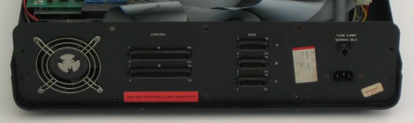 The labeling of the connectors is a bit confusing. "CONTROL A" is for the cable to the Model II, "CONTROL B" is for the other three external disks. Each of those is also connected with one of the "DATA" connectors. |