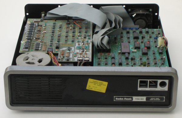 The disk is not only 8 MByte, but also 8" wide. It is below the board at the left side. On the right is the controller board, made by Tandy. Below this is the power supply. The disk is a Shugart Associates 1004. The controller used the Signetics 8x300 controller, which implemented in software the core functionality of what later became the WD1010 controller. The already existing WD1000 chipset was used for the MFM encode, decode, write precomp, etc. (Thanks to Eric Smith at the cctech mailing list). The bus between the Model II and the controller is a custom variant of the WD1002 bus. Apart from rewiring, it contained an extra address bit register for the Write Protect logic. The later Radio Shack harddisk controllers had a Model III compatible bus. This lacked the CS signal and added an EXTIOSEL signal to switch databus buffer direction. |