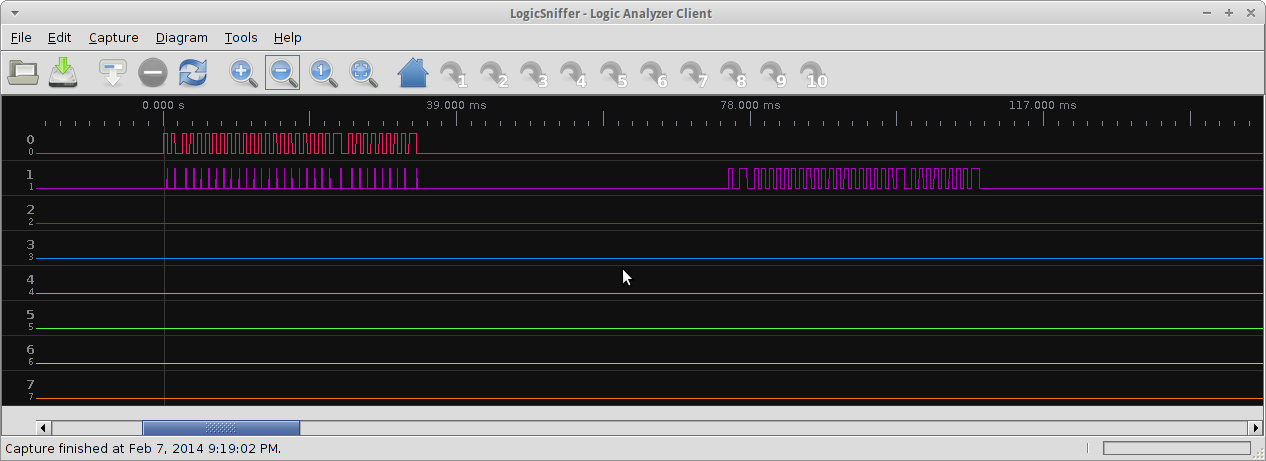 Initially the example did not produce useful data, only an occasional "M:0:0" message. This was fixed by adding the line OT_StateMachine.transitionTo(GetPeriod).update(); to the loop.