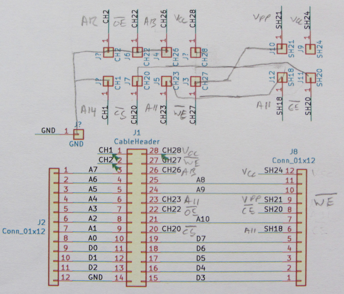 Here an example pod configuration, for the 2532 EPROM. With the WR* signal connected to the Vpp pin, write access is possible. Note only the memory range 0000h-1FFFh (Arduino side) is visible to the SBC at the address range of the ROM-socket.