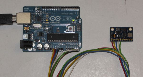 Inspired by the The Gloves Project we started creating a similar gadget. The first incomplete version is implemented on an Arduino UNO and uses the 9-Axis module (the 10-Axis module looks the same, is slightly cheaper and red)