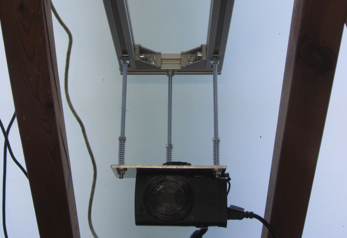 The camera platforms are raised with three M4 threads so the camera lens ends up in-line with the center of acrylic platen it faces. The threads are 145mm long. Because the beams are perpendicular to the opposing plate, no extra correction for the platen-camera distance is needed. The threads attach to the camera platform. Having three adjustment points makes alignment simple. To make adjustment even simpler, the camera platform nuts are spring-loaded.