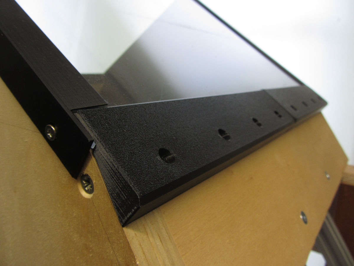 The acrylic platen are supported and attached to the frame with 3D-printed rulers. Apart from the 55 degree angle where the two platen meet, they need no special treatment (a small 3D-printed tool is included in the zip to help getting the proper camfer). The platen dimensions are (335 + 2 * 18 = ) 371 x 254mm, and 4 mm thick. The 254mm dimension leaves some margin for the 35 degrees camfer.
