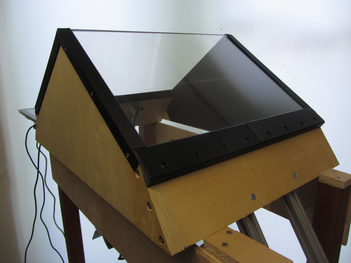 The side panels are made from 18mm plywood (multiplex), with some special angles. The top slopes, on which the plexiglas platen rest have an internal angle of 110 degrees. The lower slopes have an angle of 35 degrees to vertical, making them perpendicular to the opposite top slope. This simplifies the alignment of the cameras, independent of camera-platen distance. The height of the side panels is approximately 226mm.