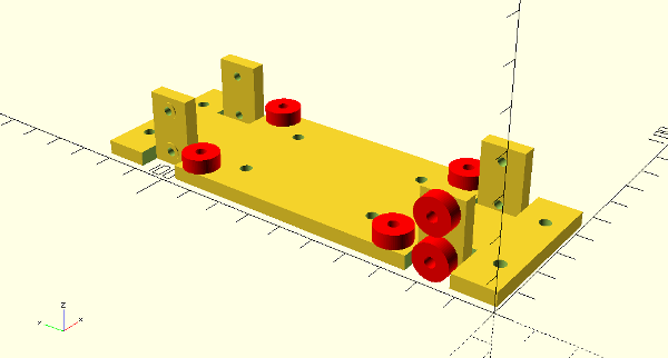 laserTrolley3.scad - The laser trolley connects to the bearings on one side, and the base plate on the other side. All bearings are attached with M3 cylinder screws. Threading is cut onto the holes. The red bits are some of the bearings, not to be printed. |