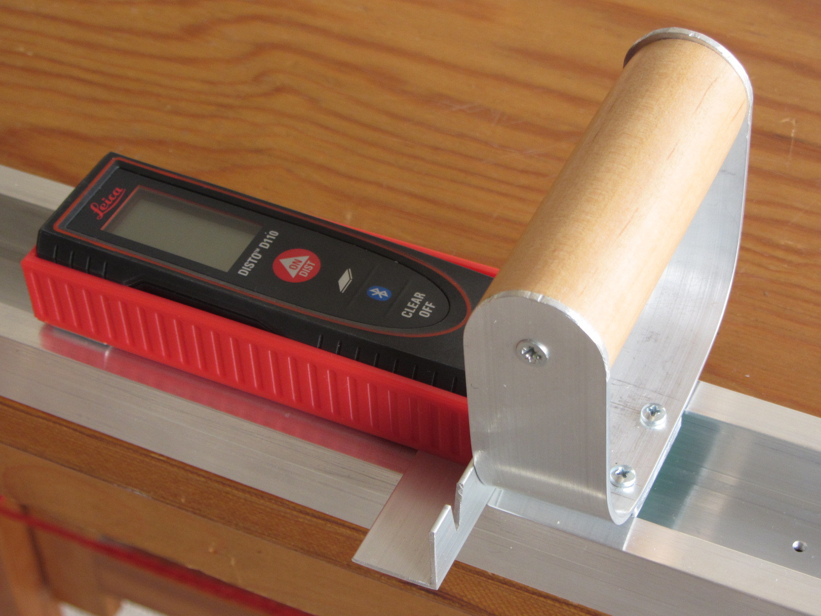 The line attachment point and handle are attached directly to the base plate. The prototype has a laser meter cage for the Leica GeoSystems D110 device. This device is Bluetooth enabled and can insert measurement data into a spreadsheet (on Windows 10, with a special driver installed. Alas not yet with Linux).