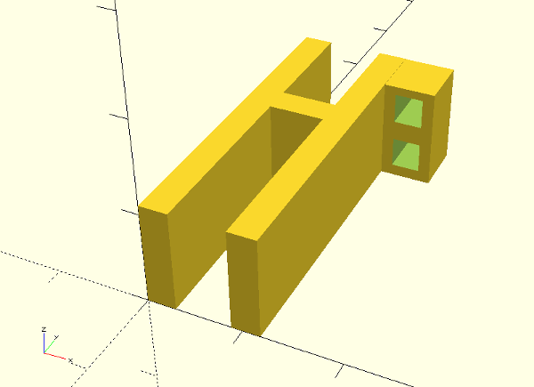 highTwoWheels5.scad - attached to the inner riser attachment ruler. Two bearings are attached; one horizontally to the side and one vertically to the bottom. The latter uses the separate axis1.scad part. |